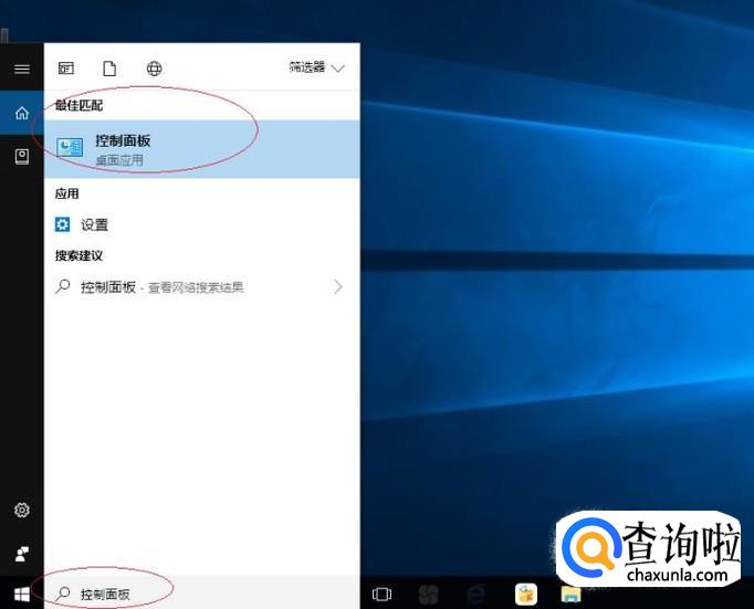 如图所示,搜索框输入"控制面板"。Cortana(小娜)显示搜索结果,点击"最佳匹配→控制面板"项。