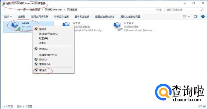 如图所示,唤出"网络连接"选项。鼠标右击"WLAN"图标,弹出快捷菜单选择"属性"项。
