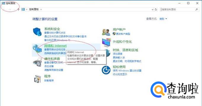 唤出"控制面板"程序窗口,如图所示。点击"网络和Internet"图标,用于检查网络状态并更改设置。
