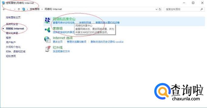 如图所示,唤出"网络和Internet"选项界面。点击右侧"网络和共享中心"图标,用于打开"网络和共享中心"选项界面。