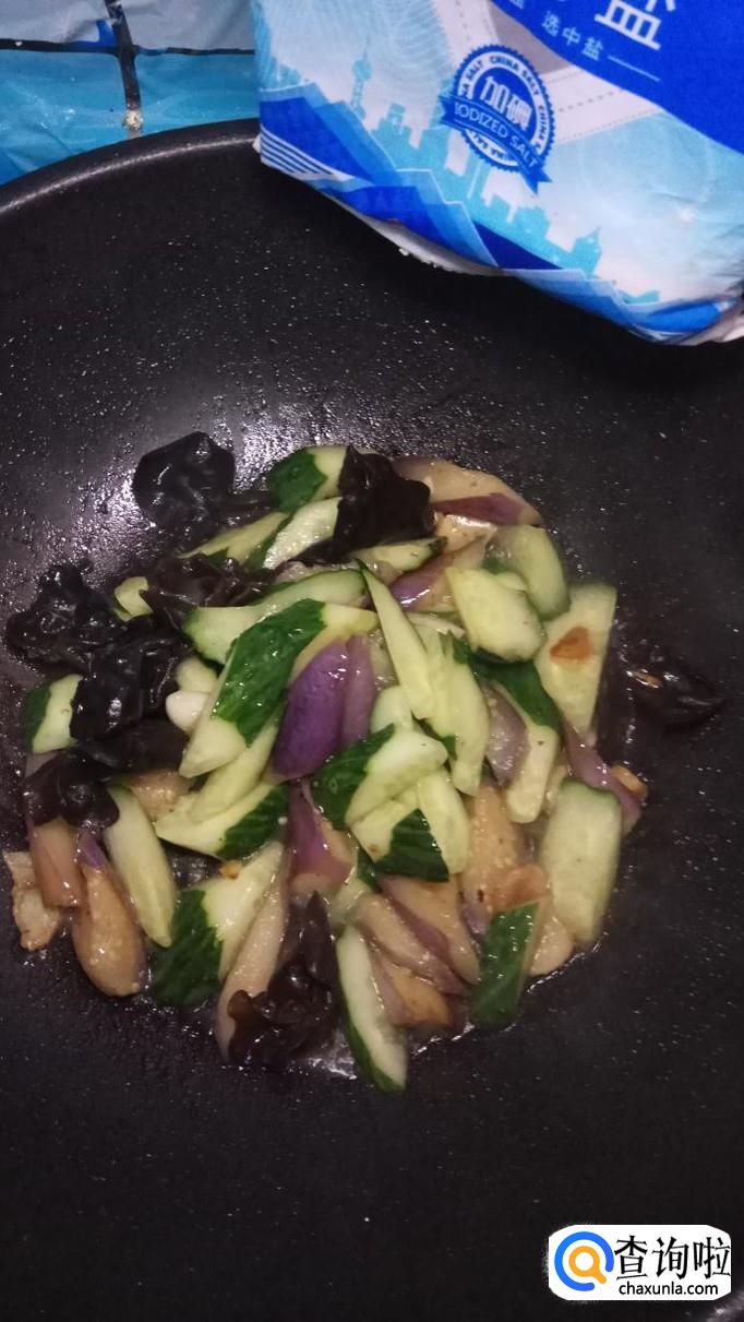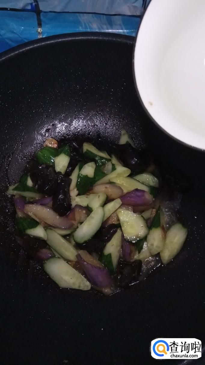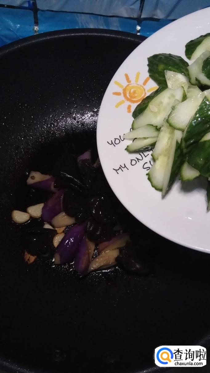 将黄瓜倒入锅中,与茄子一起翻炒。