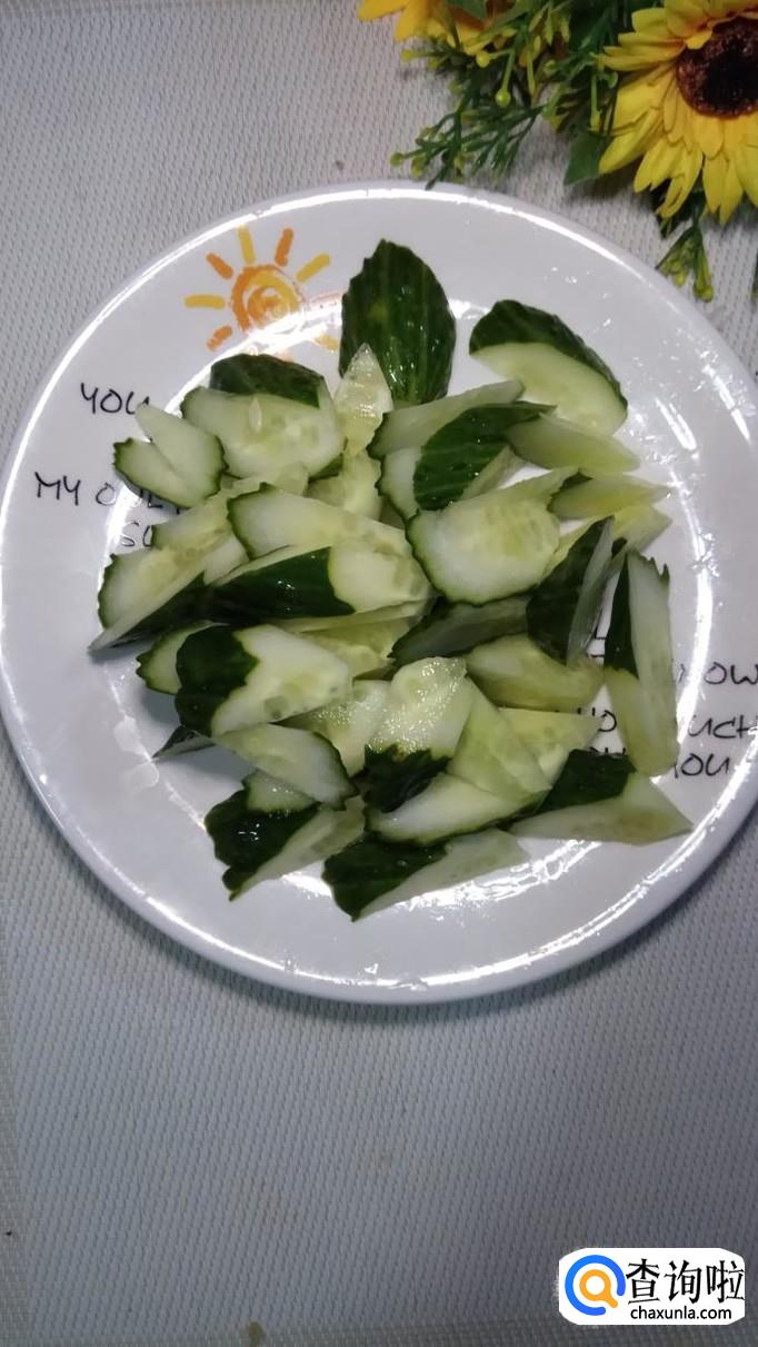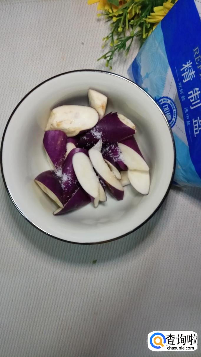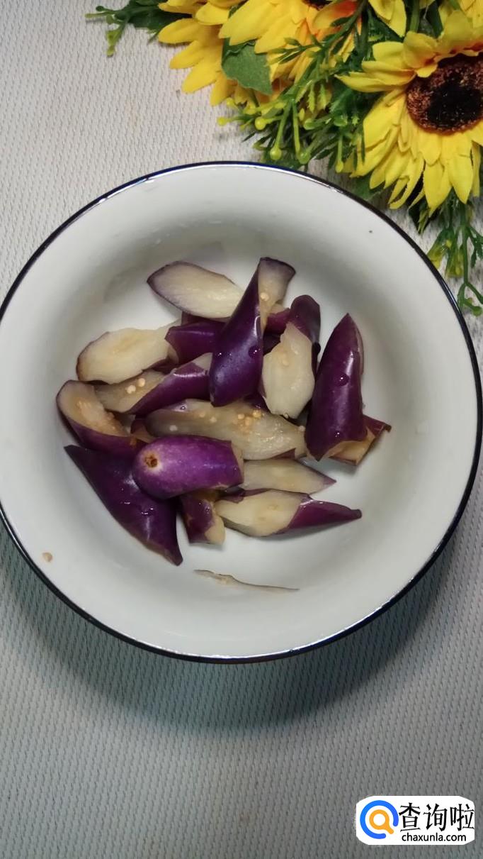 将黄瓜切成滚刀块儿,放入盘中备用,将茄子也切成滚刀块儿,加入适量盐,腌15分钟,然后用手捏去水分倒掉,用清水冲一下,备用。