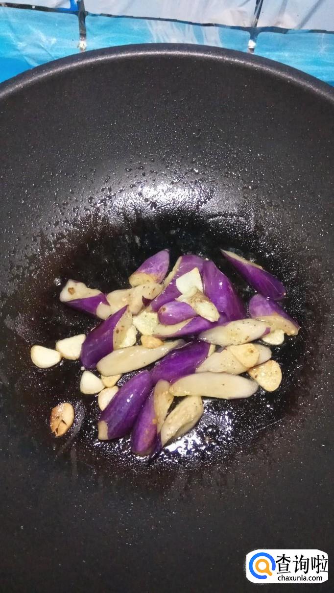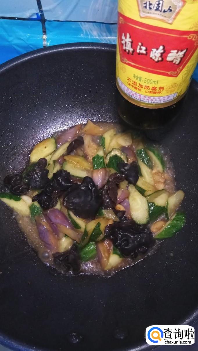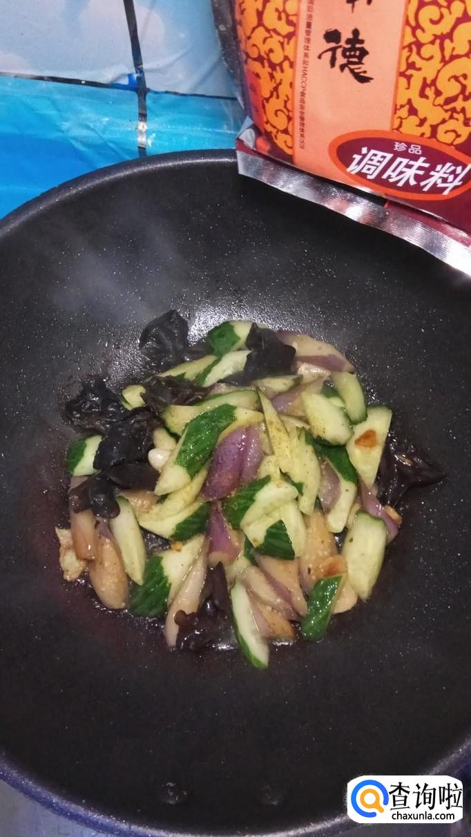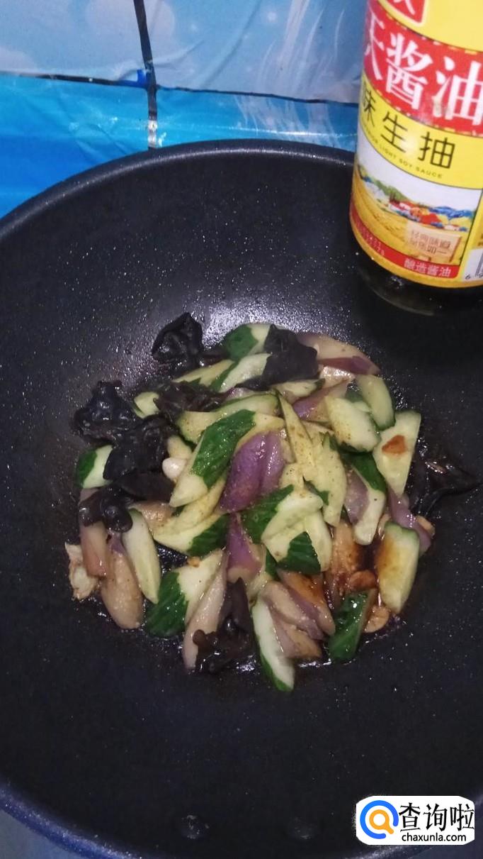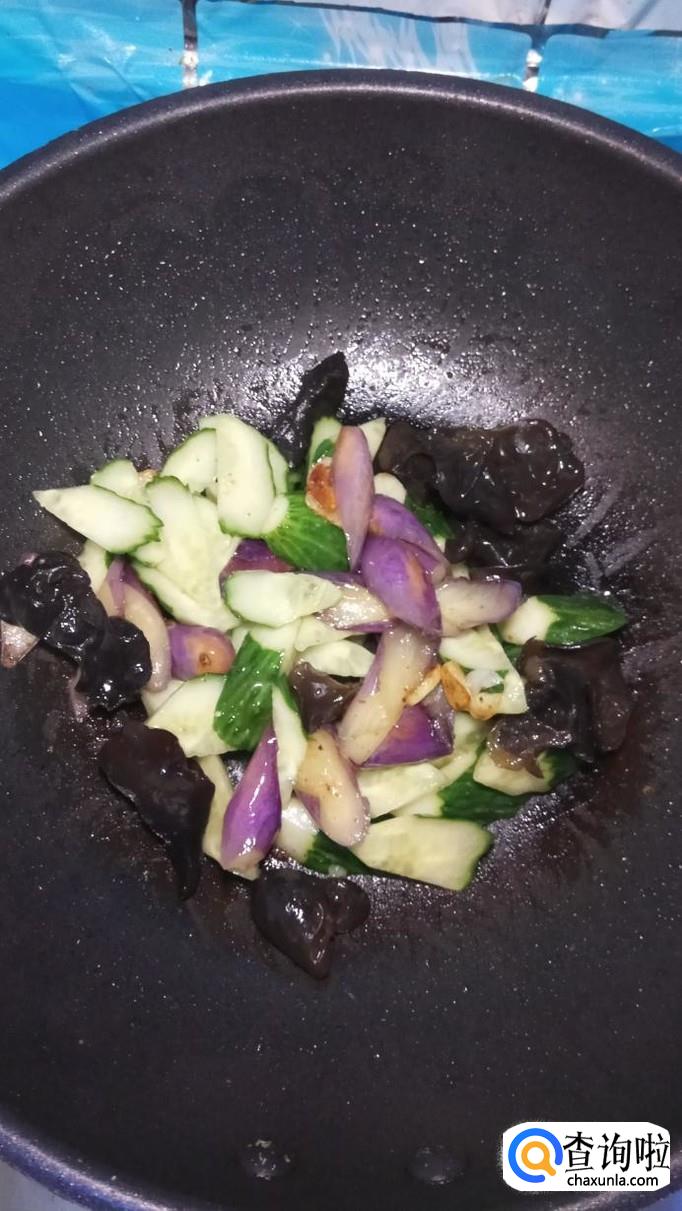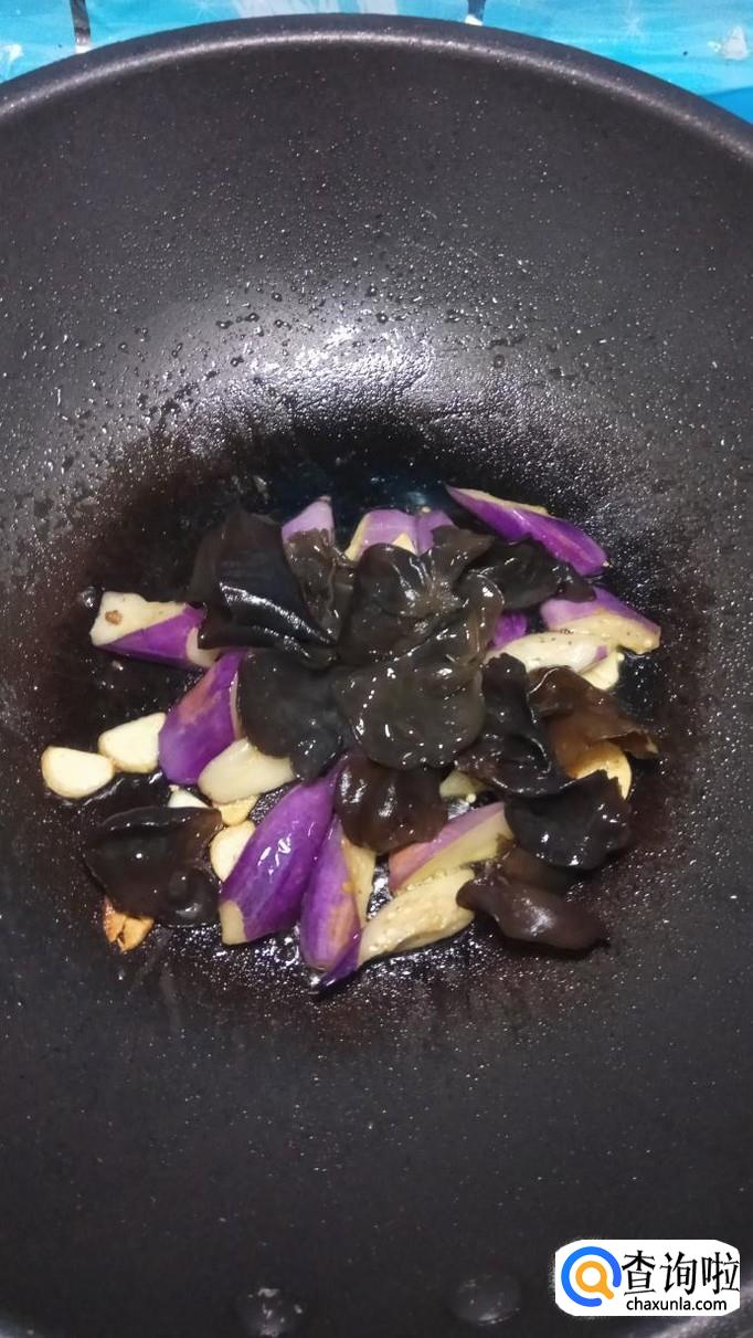 将腌好的茄子放入锅中翻炒均匀,茄子很快就裹上一层漂亮的颜色。再将泡发好的木耳也放入锅中。注意,火候不能太大。