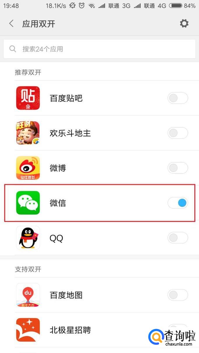 在应用双开功能页面中,可以看到应用自动提供了微信应用双开的开关按钮。