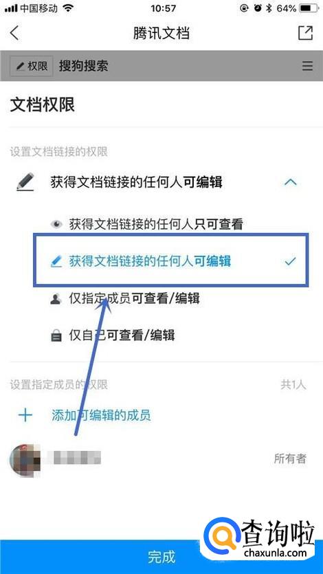 然后选择获得文档链接的任何人可编辑,如下图所示。