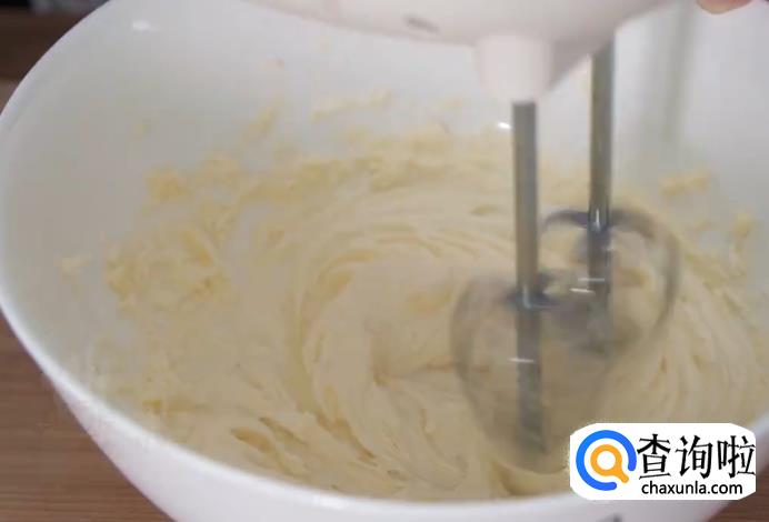之后分两次打入蛋液,打至与黄油完全融合。