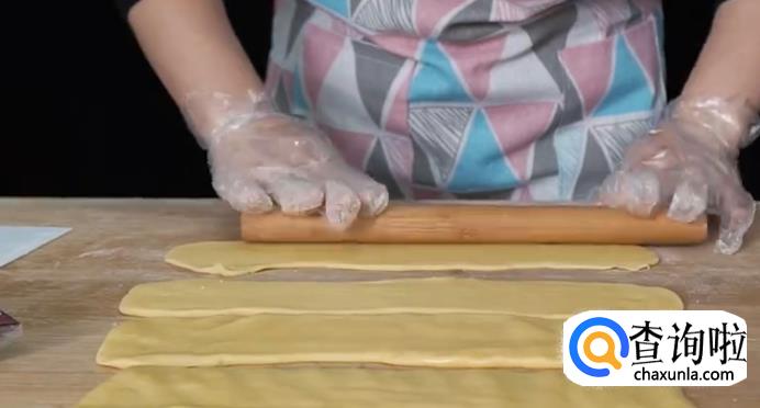时间到了后取出面团,分成4份搓成长条擀平裹入豆沙馅,卷起来搓圆条。