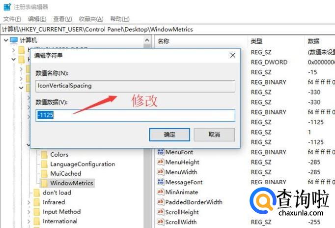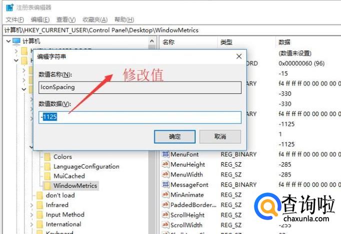 然后在弹出的编辑字符串值的界面中将IconSpacing的值修改一下,大家根据自己想要的距离修改即可,如下图所示