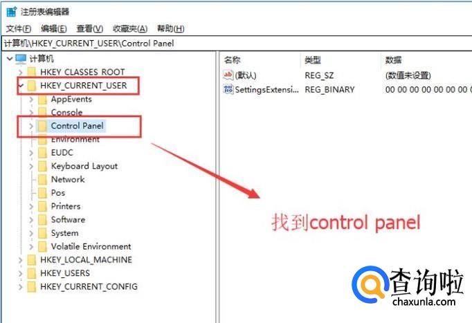 在打开的注册表界面中我们找到HKEY_Current_User下的Control Panel文件夹,如下图所示