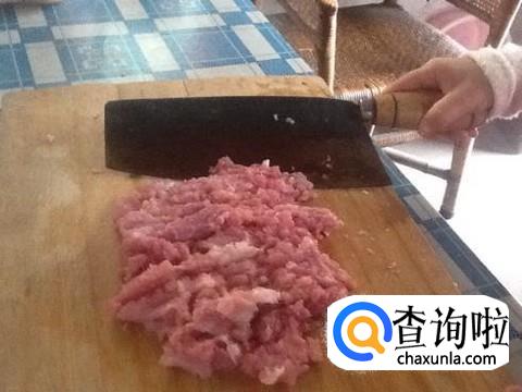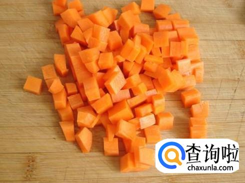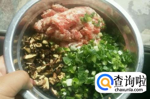 将胡萝卜、肉、火腿和香菇洗干净后剁细,不用剁得太细,胡萝卜可以切成颗粒状,然后放在一个碗里加入调味料搅拌。