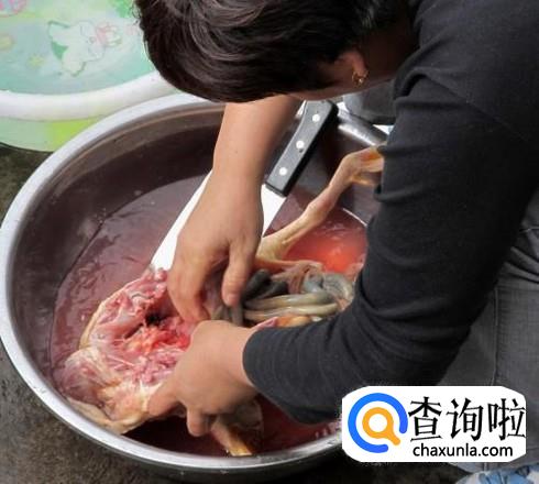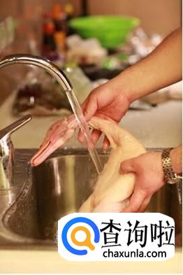 将鸭子洗干净,同时从鸭子肚子上划一个口,把鸭子体内的一些内脏从这个口里取出,并将鸭体内冲洗干净。