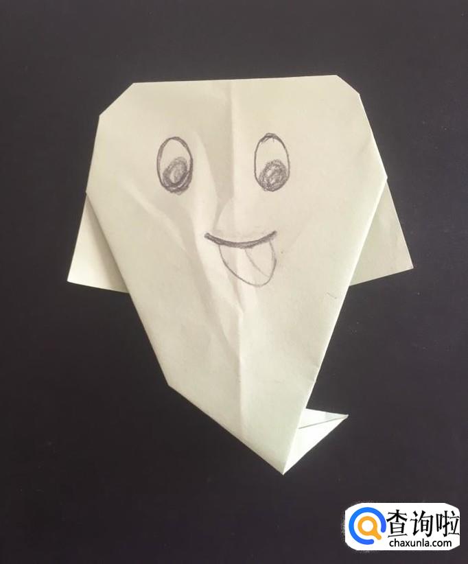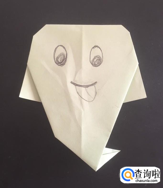 翻回正面,用笔画上幽灵的眼睛、嘴巴和舌头,这样幽灵就折好了。