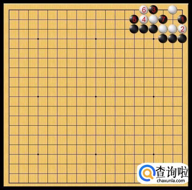 这个时候,黑棋在黑7处落子,黑7的落子使得黑棋形成了双打吃。黑棋不仅可以打吃白棋左边底线的白三子,而且还可以打吃白棋右下的白三子。白棋无法兼顾到两处,于是,白棋只能接受被打吃其中一处的事实。这样,白棋就不能存活。看来,黑3的落子真是后患无穷啊!如图所示。