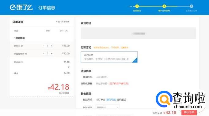 点击去结算,跳转到订单页面,补充自己的收货地址等信息,点击确认下单,在线付款后,就可以静静的等待美食了