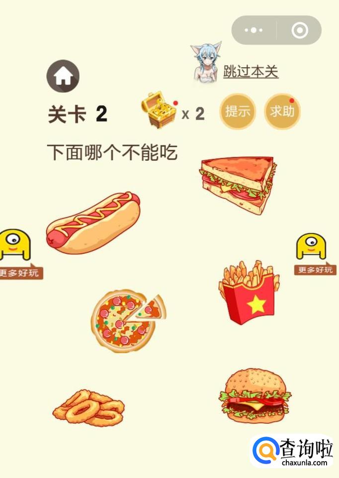 第二关,题目问哪个不可以吃,这个还是比较简单的,薯条的包装是不可以吃的