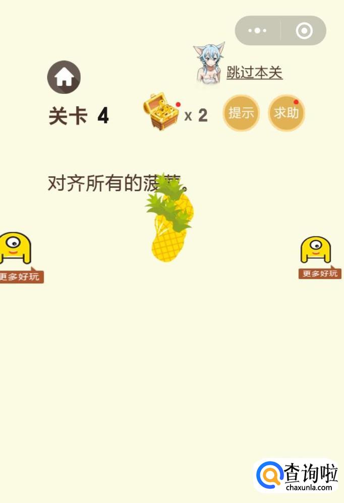 再介绍下第四关,题目要求对齐所有的菠萝,这个需要考虑题目中包含的菠萝二字,将菠萝和文字重叠放在一起,就可以轻松的过关了。其他的关卡差不多难度,多动动脑,也是可以轻松的过关的