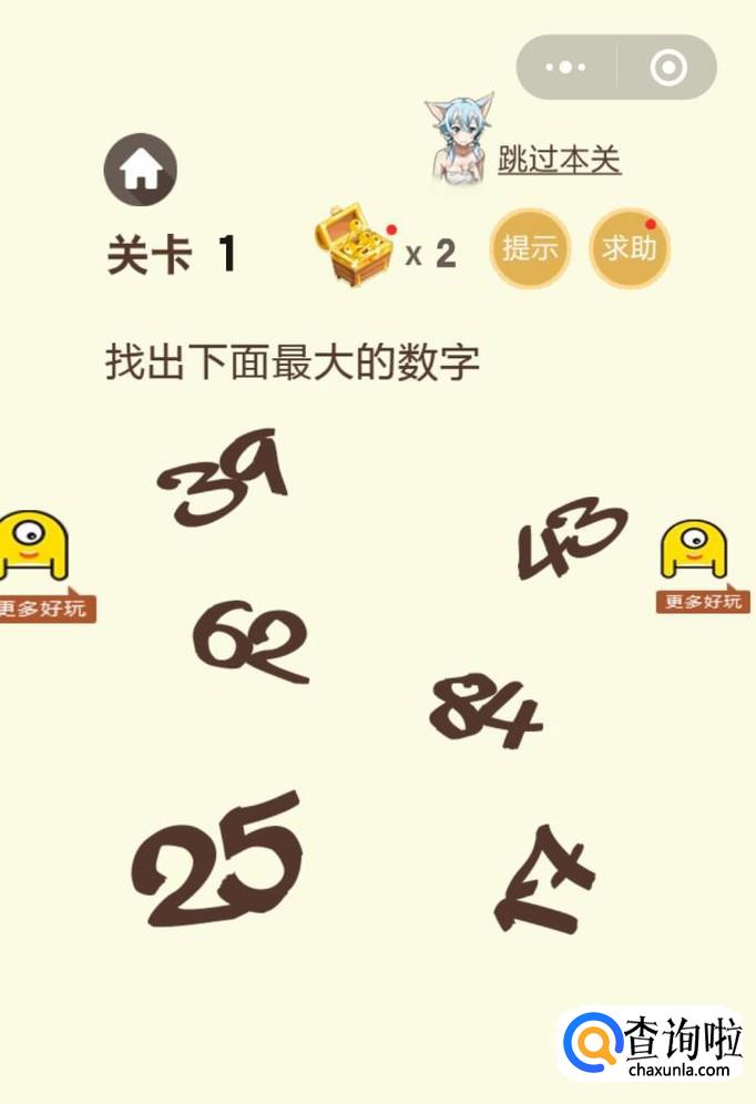 进入第一关,题目要求找到最大的数字,但是最大可以从面积大小和数值大小来考虑,一个是84,一个是25,选择一下就可以过关了