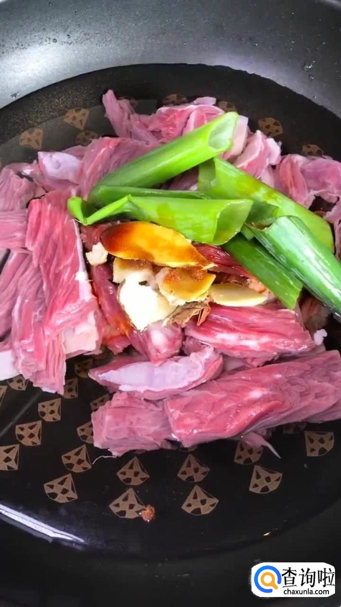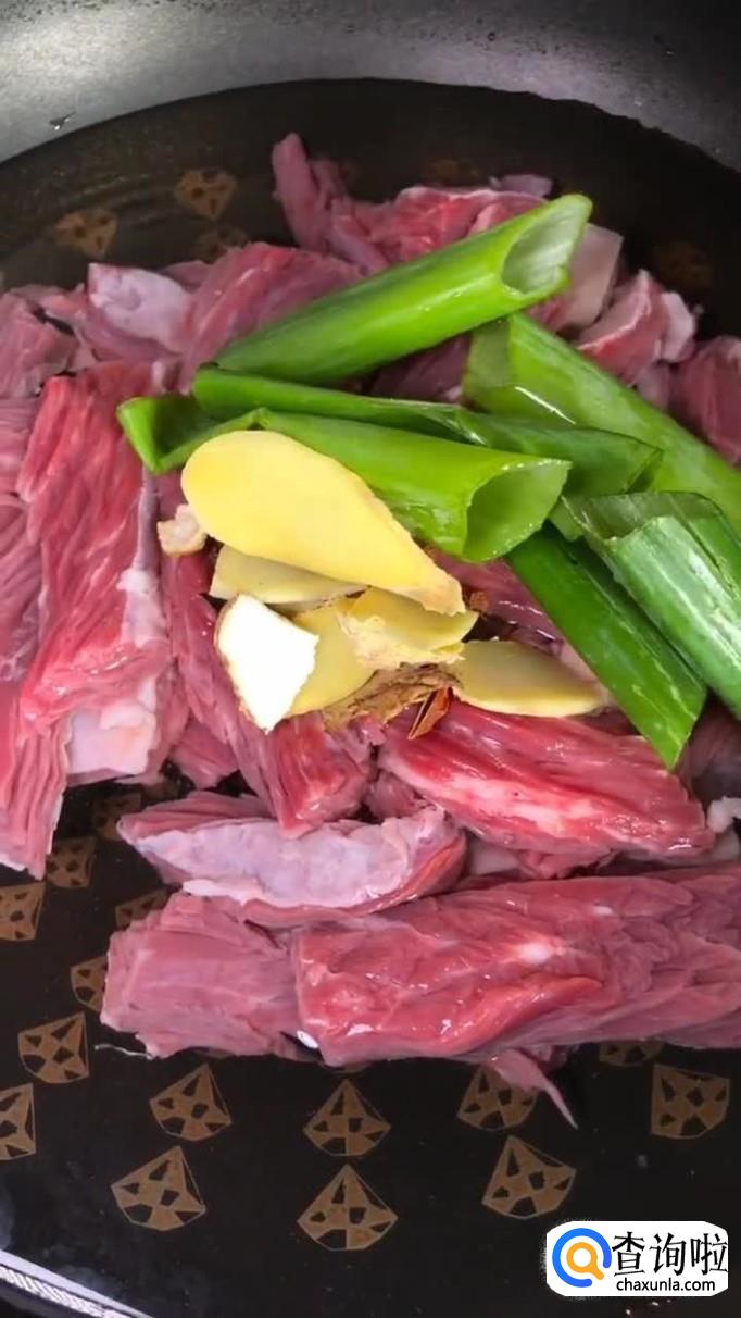 然后锅中放入适量的清水,把牛肉倒入锅中,如下图所示。
