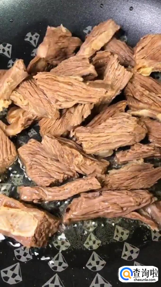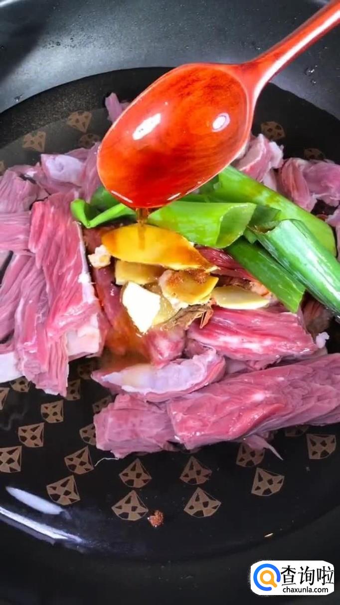 接着把牛肉倒入锅中煸炒3分钟,如下图所示。