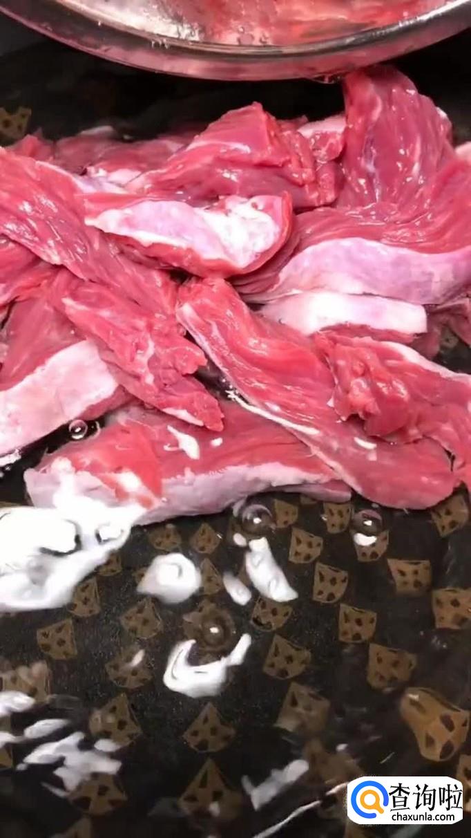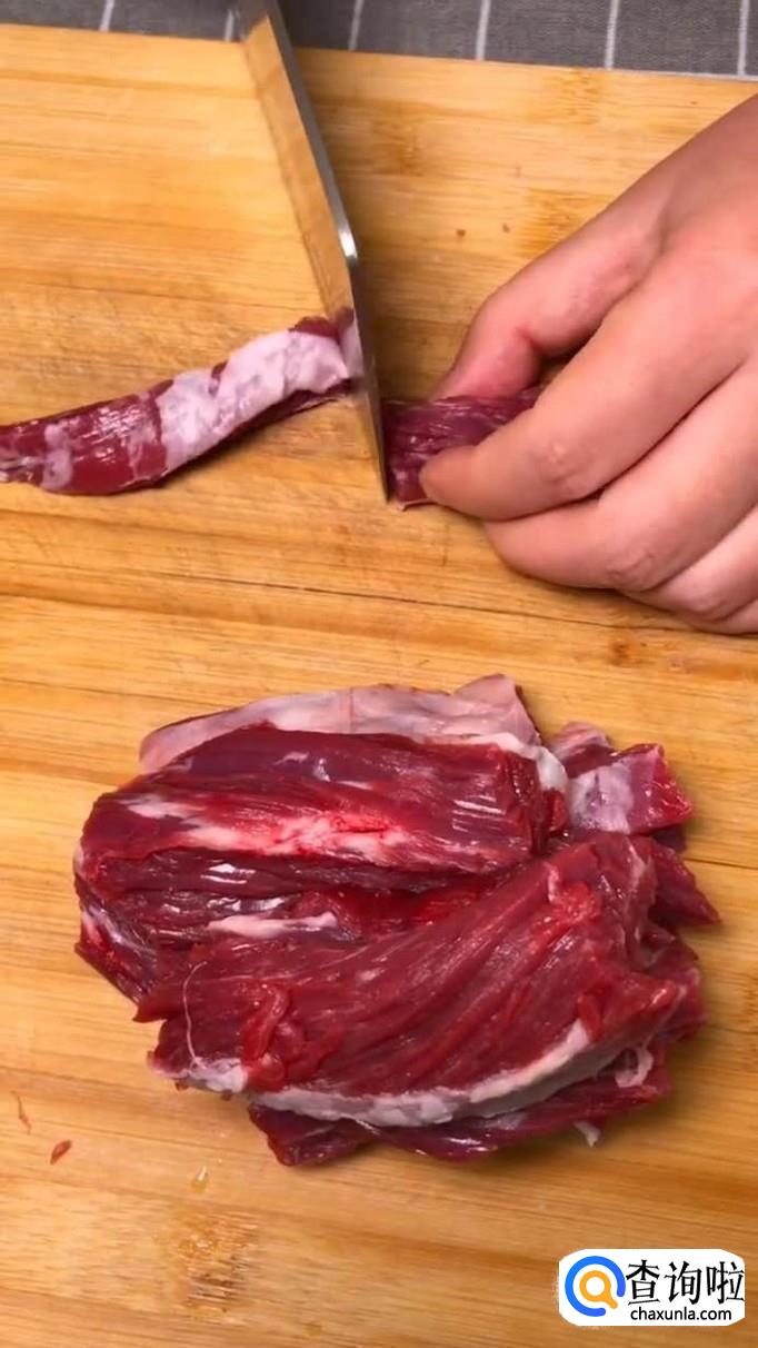 首先将买回来的牛肉清洗干净,切成条,如下图所示。小贴士:大家在切牛肉的时候,一定要顺着纹路来切这一点很重要。