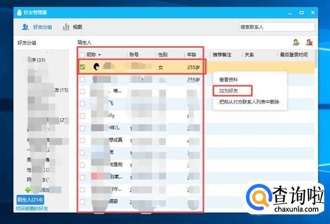 弹出的界面,我们就可以看到所有的单项好友了,我们右击其中一个好友,弹出的界面,我们点击加为好友就可以了,之后对方同意就加为好友了。