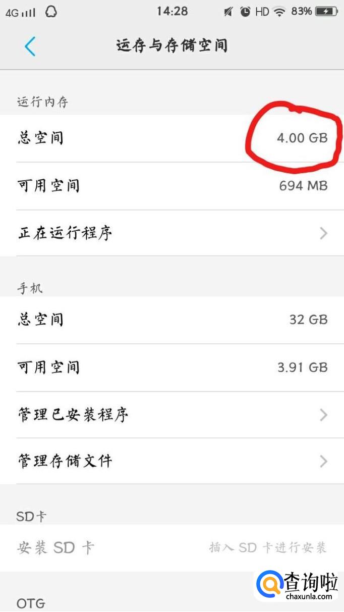 在“运存与存储空间”界面会显示出手机运行内存大小,也就是手机卡大小。