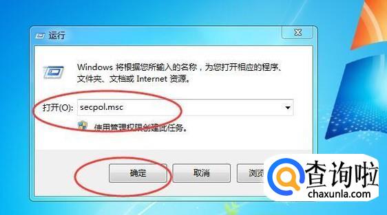 在运行窗口中,输入【secpol.msc】,然后点击【确定】按钮,如下图所示: