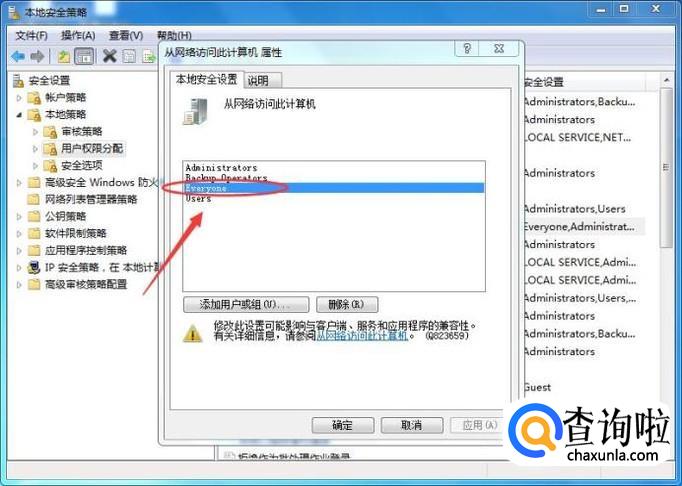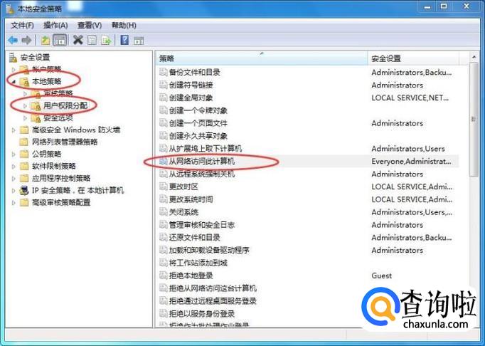 逐步打开【本地策略】---【用户权限分配】--【从网络访问此计算机】,如下图所示: