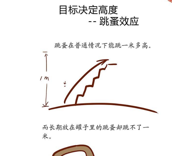 跳蚤效应指跳蚤调节了自己跳的目标高度,而且适应了它,不再改变。暗指现在很多人不敢去追求梦想,不是追不到,而是因为心里就默认了一个“高度”。这个“高度”常常使他们受限,看不到未来确切的努力方向。