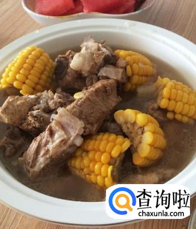 然后我们把过完水的腔骨倒入砂锅中,只需要倒入一些盐就可以了,先大火烧一个小时然后转小火一个小时,转小火的时候把玉米丢进去煮,然后就可以出锅了。