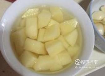 将土豆削皮洗净后切成小方块,泡入水中,往水中加一点盐。
