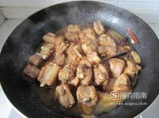 起锅烧油,待油热后加入配料炒香,再加入排骨煸炒,待排骨表面有微微焦褐感加入老抽和耗油。
