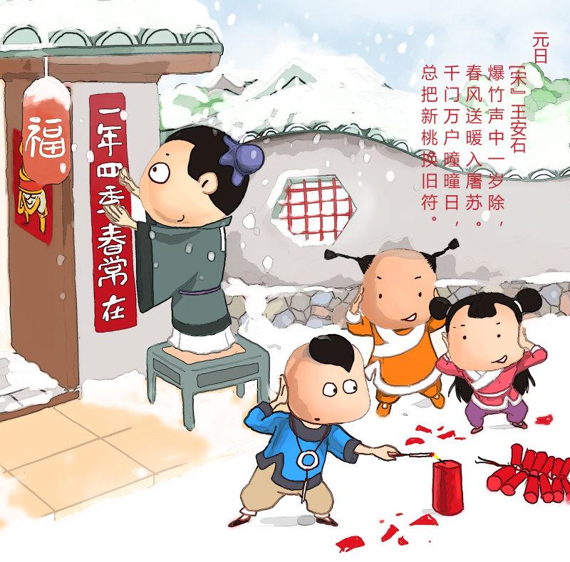 《元日》是北宋政治家王安石创作的一首七言绝句。这首诗描写新年元日热闹、欢乐和万象更新的动人景象,抒发了作者革新政治的思想感情,充满欢快及积极向上的奋发精神。其中“总把新桃换旧符”中”新桃”是新的桃符的意思,桃符,古代一种风俗,农历正月初一时人们用桃木板写上神荼、郁垒两位神灵的名字,悬挂在门旁,用来压邪;也作春联。