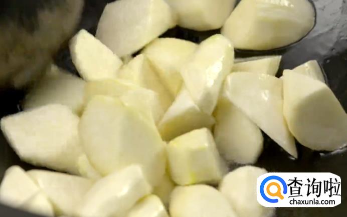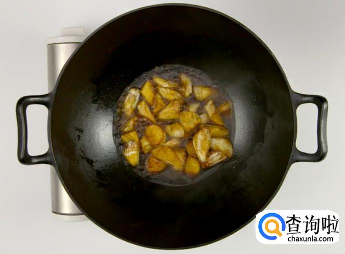 之后起锅热油下茭白块,翻炒至发黄。