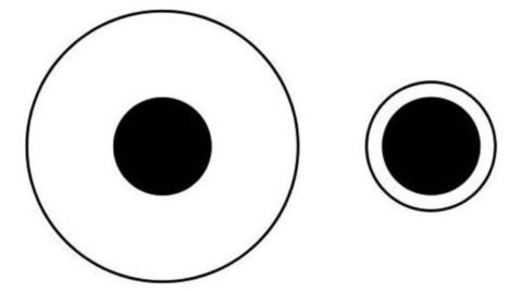 这是经典的德勃夫大小错觉图例。中间的黑色圆圈的面积本来是一样的,但是由于人们的大脑将其外部的白色圆圈做了对比,产生了错觉:外部的白色圆圈越大,黑色圆圈看起来就越小。在一项研究中,将德勃夫错觉图例中的白色圆圈换成了盛放食物的盘子,而黑色圆圈则代表食物,检验人们在判断食物份量时是否也会产生“德勃夫错觉”。
