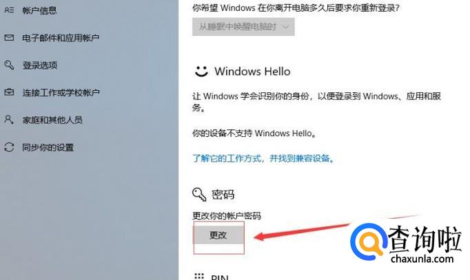 在登录选项页面,我们可以找到密码下面的更改,点击。
