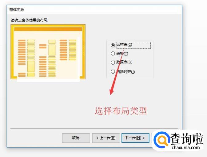 然后会让我们选择窗体的布局,这里我们直接默认选择纵栏表,如下图所示