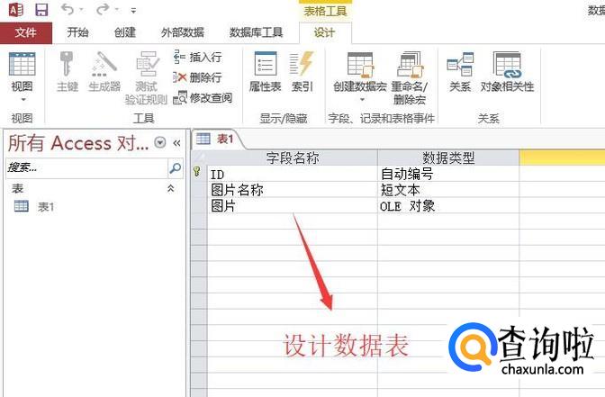 接下来我们设计一个表,表中需要有图片字段,注意字段的类型是OLE对象,如下图所示