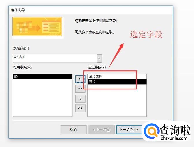 在弹出的窗体向导界面中我们选定要使用的字段,这里小编按下图所示进行选择