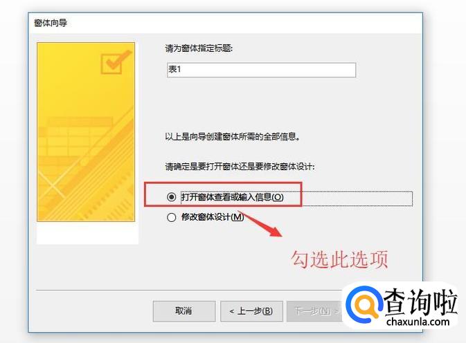接下来需要给窗体指定一个标题,然后勾选”打开窗体查看或输入信息”选项,如下图所示