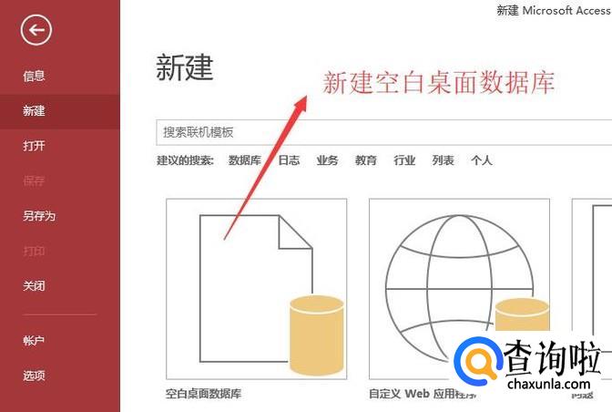 首先打开Access数据库,进入新建界面,点击空白桌面数据库选项,如下图所示