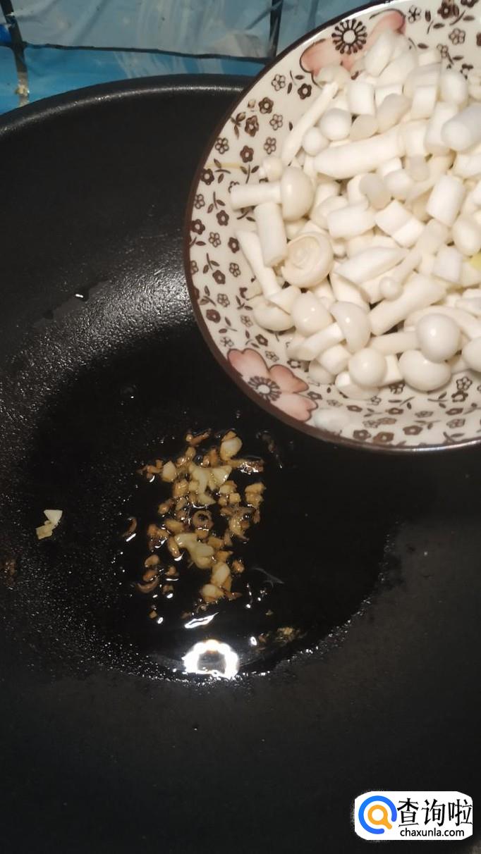 准备适量姜和蒜,洗净后切碎备用,炒锅中放入适量油,油热后将姜末和蒜末放入锅中炒香,然后将海鲜菇放入锅中,翻炒均匀。