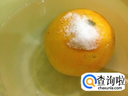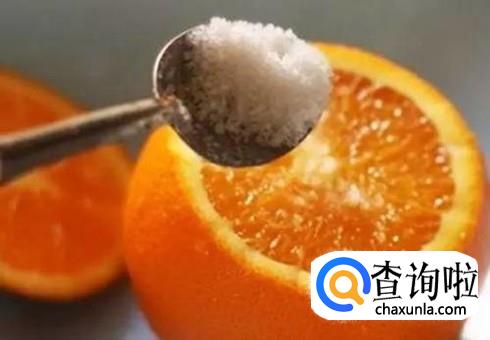 沿着橙子的四分之一处切开,使橙肉露出。然后,在橙肉上放入少许的食用盐,用餐具轻戳几下,使食用盐融入橙肉内部,更好的入味。