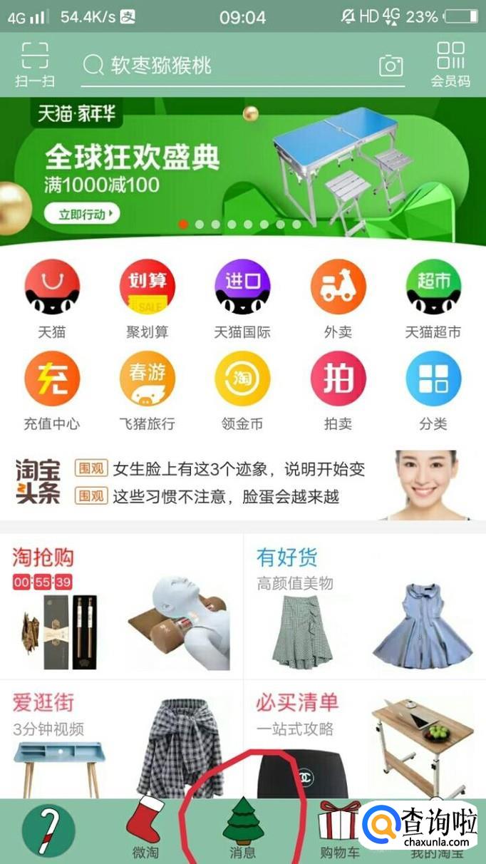 打开淘宝后,首先点击消息。
