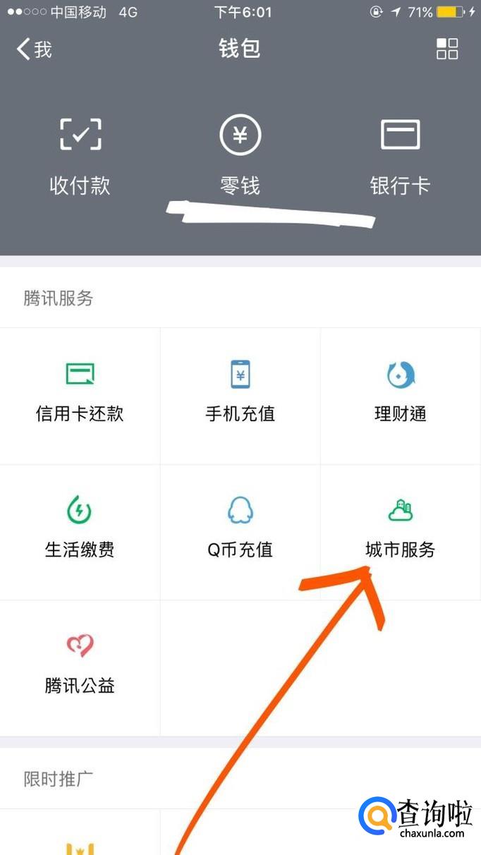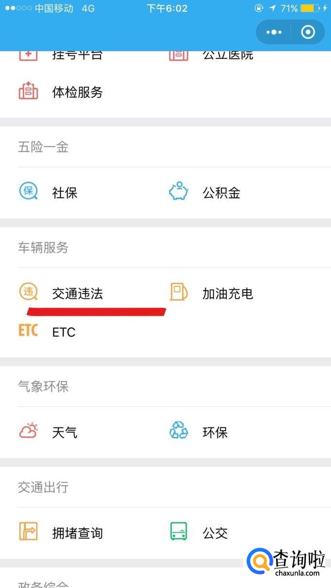 选择你的城市,向下滑找到车辆服务,点击交通违法
