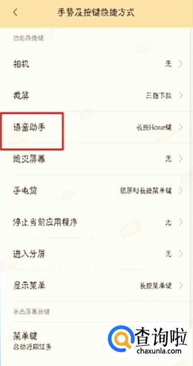 在手势及按键快捷方式里面找到语音助手,点击进入。