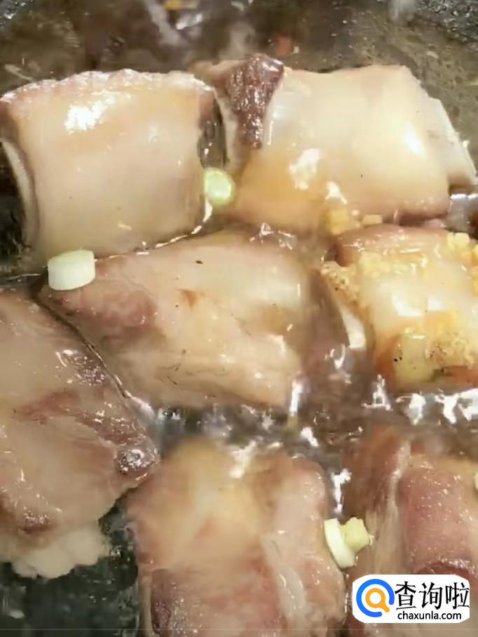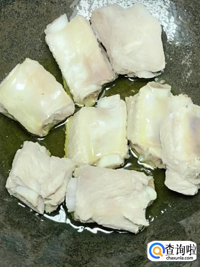 准备好一个锅子锅子放入适量的油煮过的排骨放入锅中,炒至排骨两面金黄,用勺子舀去多余的油。