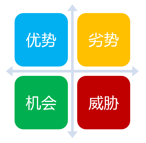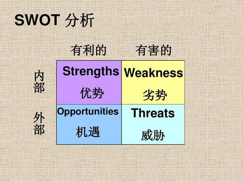 运用这种方法,可以对研究对象所处的情景进行全面、系统、准确的研究,从而根据研究结果制定相应的发展战略、计划以及对策等。swot中S (strengths)是优势、W (weaknesses)是劣势,O (opportunities)是机会、T (threats)是威胁。按照企业竞争战略的完整概念,战略应是一个企业“能够做的”(即组织的强项和弱项)和“可能做的”(即环境的机会和威胁)之间的有机组合。