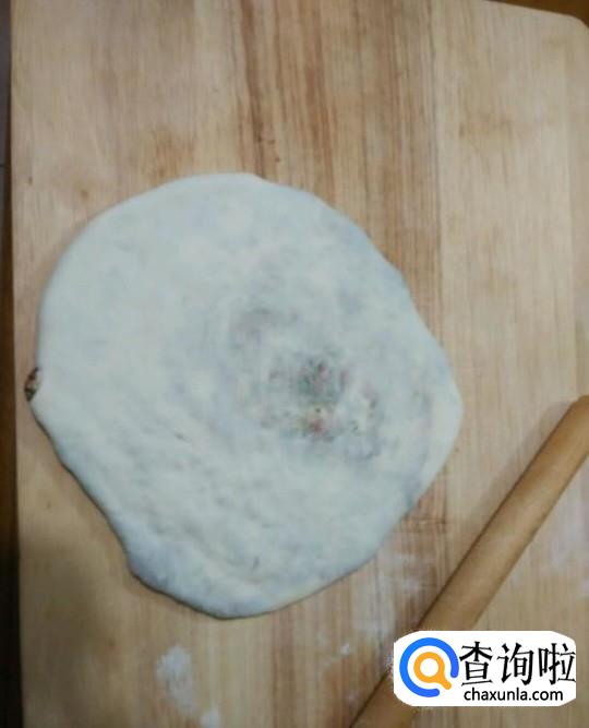 然后将搅拌好的牛肉和葱均匀的包在我们揉好的面团里,然后我们再将牛肉面团用擀面杖压成饼状。
