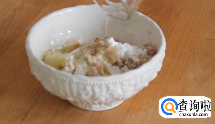 将打碎后的肉末倒入碗中,加入三分之二生粉、适量酱油、生抽、料酒、蛋清搅拌均匀。